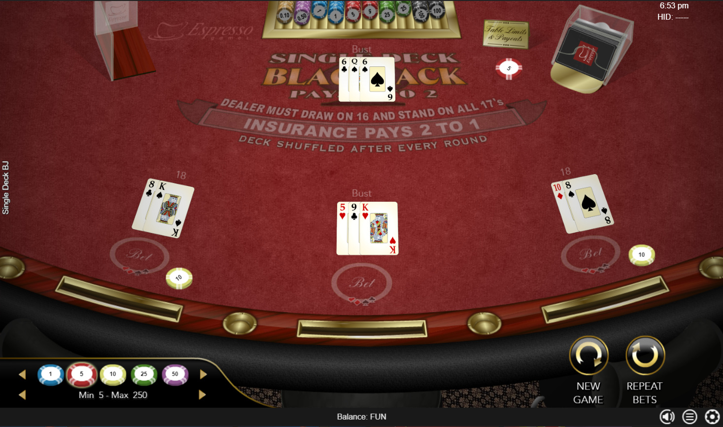 Os três jogos de blackjack têm o mesmo layout, no qual o jogador pode apostar de uma a três mãos. Todos os três alertam o jogador sobre erros, com base na estratégia básica apresentada no arquivo de ajuda "guia". Surpreendentemente, para um cassino online, o conselho dado é realmente correto. Na verdade, a estratégia leva em consideração até mesmo o número de cartas na mão do jogador ao jogar 16 contra 10 (uma jogada extremamente arriscada, onde as probabilidades favorecem pedir carta com duas cartas e parar com três ou mais).