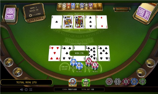 Existem muitas versões do Oasis Poker por aí. Sem poder jogar, não posso informar quais regras elas seguem, mas posso dizer que permitem trocar de uma a cinco cartas, mediante pagamento. Não informam qual é esse valor. No entanto, uma versão comum exige uma taxa de 1x o Ante para trocar uma ou cinco cartas, 2x para trocar duas ou quatro, e 3x para trocar três. Se for esse o caso, e considerando a tabela de pagamento padrão 1-2-3-4-5-7-20-50-100, a vantagem da casa é de 1,04% com a estratégia ideal. A ficha técnica do produto alega um retorno de 99,7%, mas não sei de onde tiraram esse número e estou um pouco cético quanto a ele.