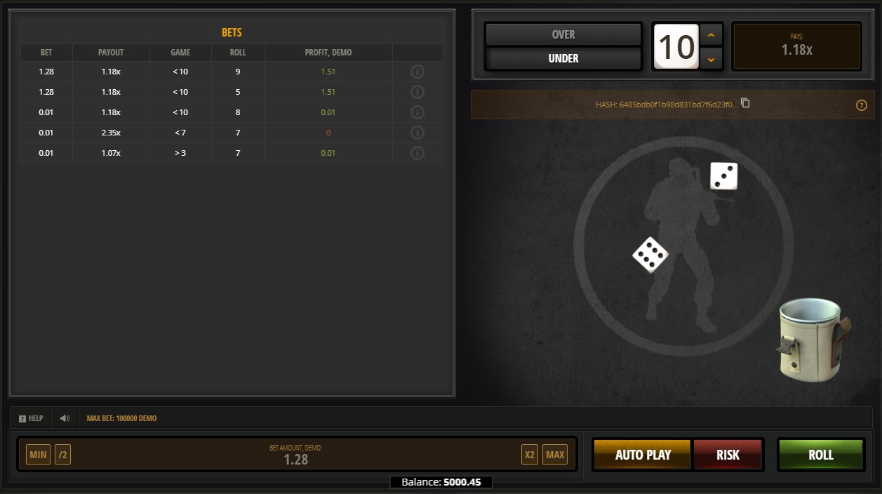 Roll the Dice é um jogo de azar simples, onde você aposta se o total do lançamento de dois dados será maior ou menor que um número escolhido pelo jogador. Ao contrário de outros "Jogos Instantâneos" da Evoplay, que geralmente têm um retorno de 96%, este jogo chega a 98,33% (nas apostas em menos de 10 e mais de 4). Para mais detalhes, consulte minha página sobre Roll the Dice .