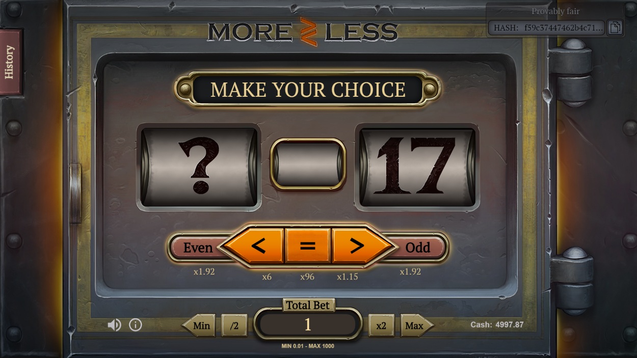 MoreLess é um jogo simples em que o jogador prevê se um número aleatório de 1 a 100 será menor, igual ou maior que o número escolhido anteriormente. As probabilidades são proporcionais à chance de ganhar. Para todas as regras e análises, consulte minha página sobre MoreLess .