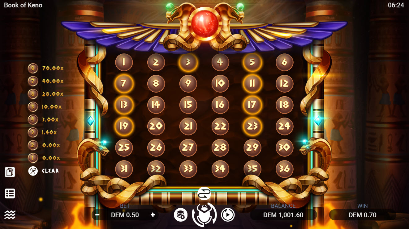 O Book of Keno é um jogo de keno jogado com 36 bolas em vez de 80. A seguir, a tabela de pagamentos.