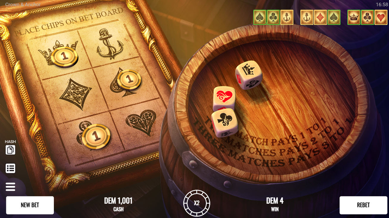 Crown & Anchor é um jogo de dados simples que funciona como as apostas em números individuais no sic bo. O jogador aposta em uma das seis faces do dado, três dados são lançados e o jogador ganha de acordo com quantos números caírem na face escolhida.