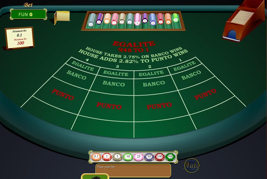 Existe, naturalmente, também um jogo de punto banco com "vantagem da casa zero". Este apresenta as seguintes apostas: