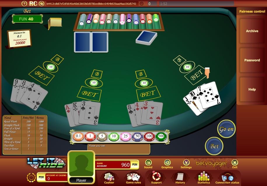 O jogo Let it Ride da Gamesys funciona como o encontrado em cassinos físicos, exceto que o jogador faz uma aposta inicial e tem duas oportunidades para aumentá-la, em vez de fazer três apostas iniciais e ter duas chances de retirá-las. Matematicamente, é a mesma coisa.