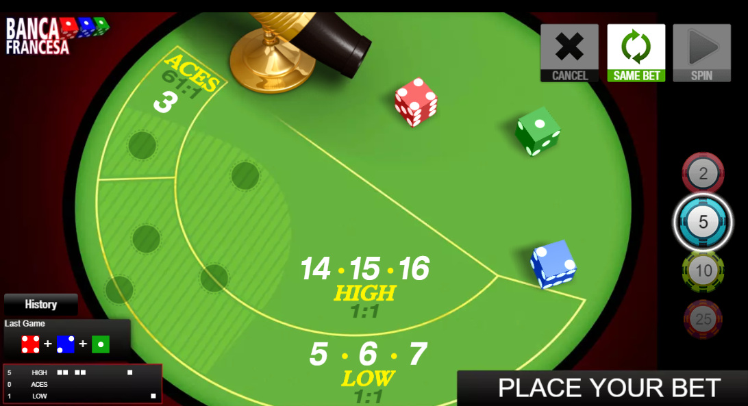 Banca Francesa é um jogo de dados português. Pode ser resumidamente descrito como uma versão simplificada do sic bo . Existem apenas três apostas, cada uma com uma vantagem da casa de apenas 0,46% se houver empates como aposta resolvida e 1,59% se não houver (há muitos empates). Para as regras completas e análise, consulte minha página sobre Banca Francesa .