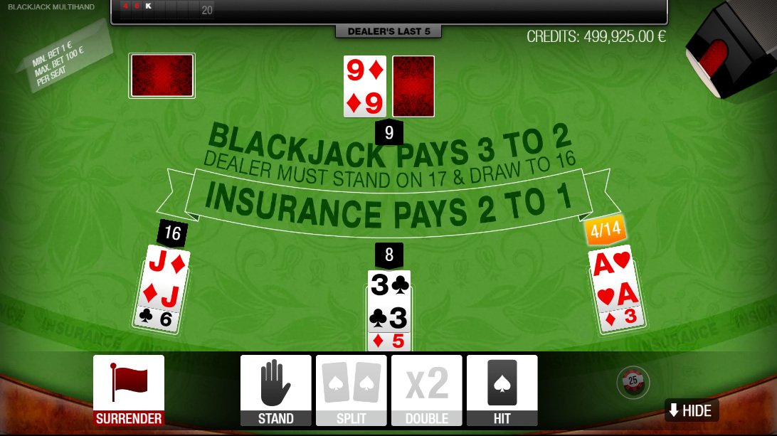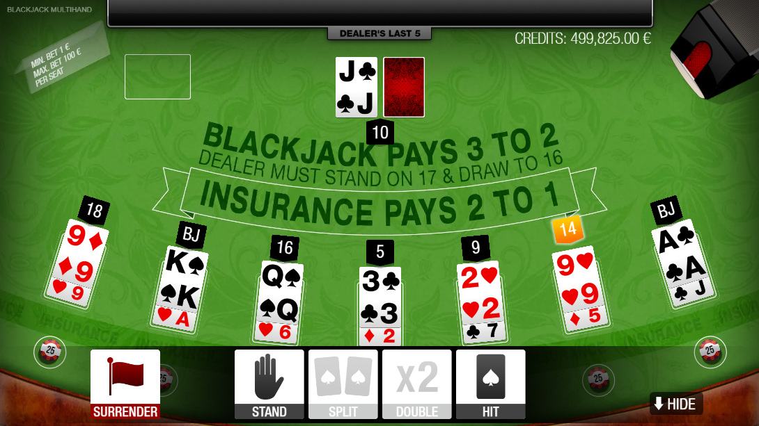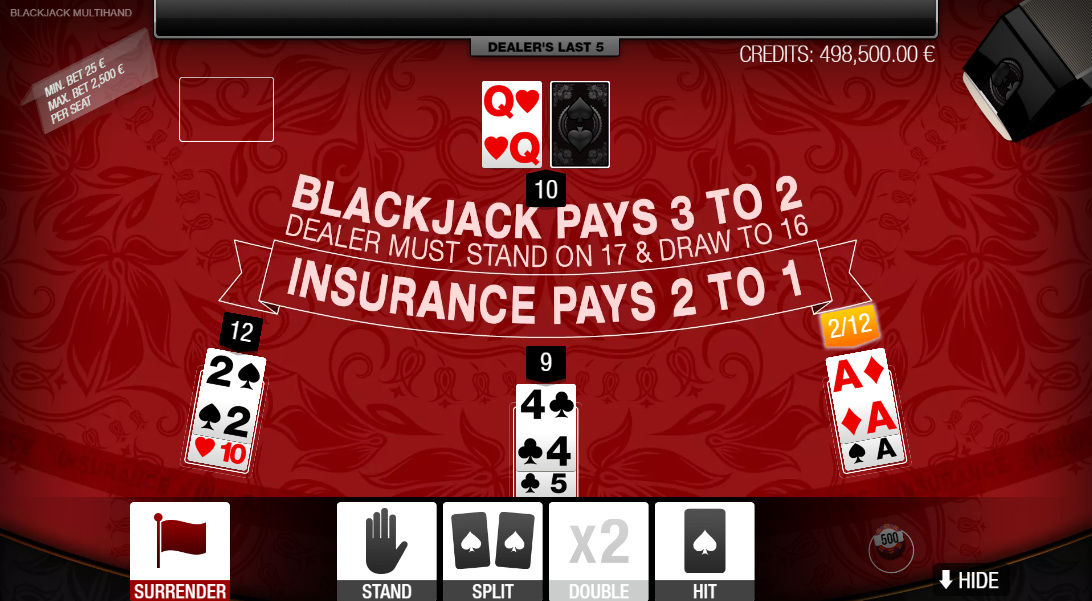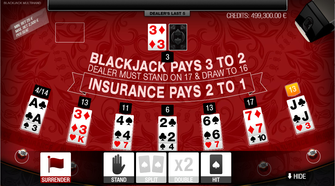 As regras são típicas do blackjack online: 6 baralhos, o dealer para no 17 suave, o dealer verifica se tem blackjack, dobra apenas de 9 a 11, dobra permitido após dividir, desistência permitida, divisão permitida apenas uma vez por mão inicial. A vantagem da casa sob essas regras é de 0,44%, de acordo com minha calculadora de vantagem da casa no blackjack .