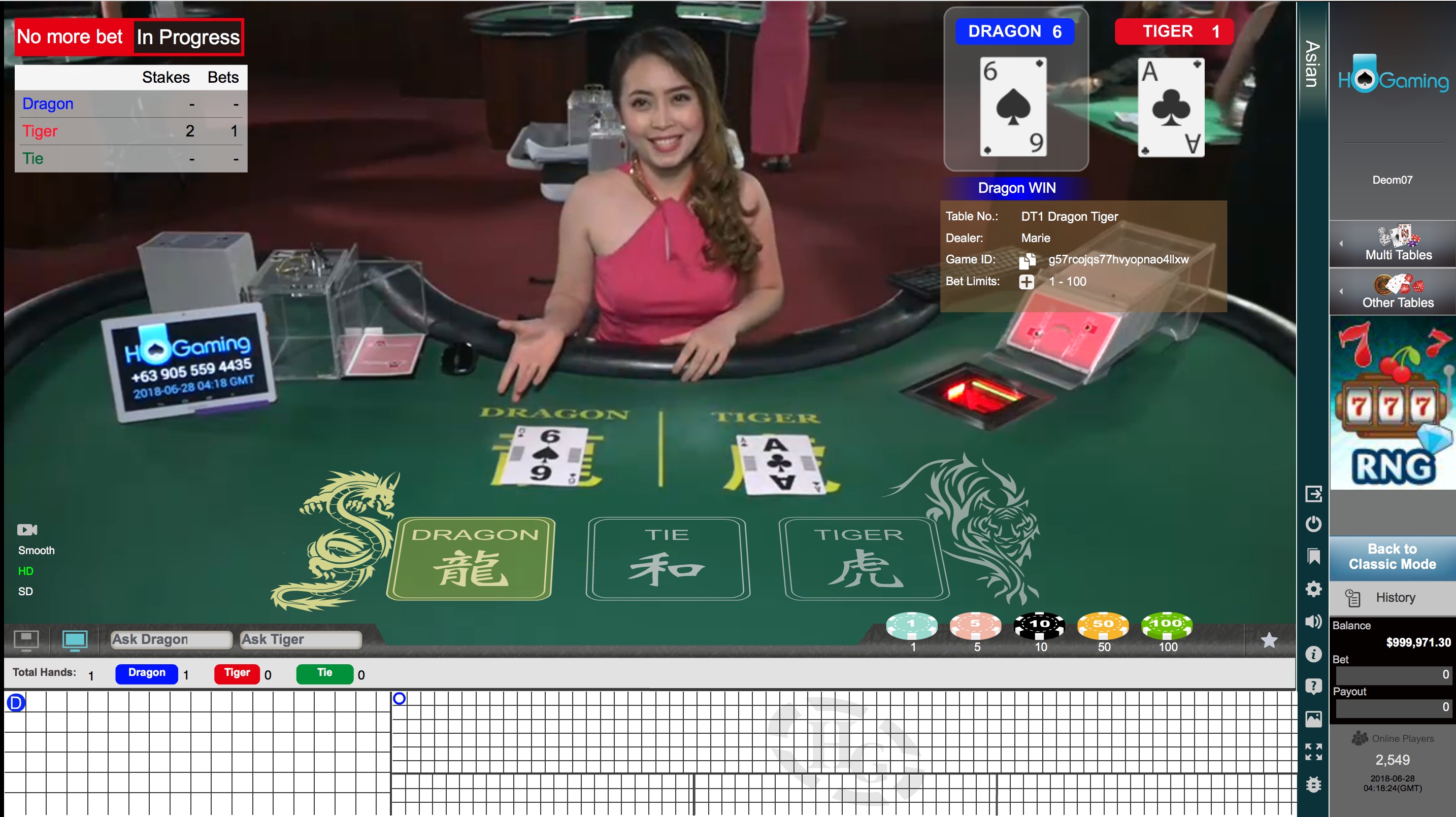 Dragon Tiger é um jogo muito simples onde as mãos do Dragão e do Tigre recebem uma carta cada e o jogador escolhe qual será a de maior valor. Há também uma aposta no empate. As apostas no Dragão e no Tigre perdem metade em caso de empate, resultando em uma vantagem da casa de 3,73%. O site da HoGaming não informa quanto paga o empate, mas em outros jogos com crupiê ao vivo, o pagamento geralmente é de 8 para 1, o que representa uma vantagem da casa de 32,77% (ai!).