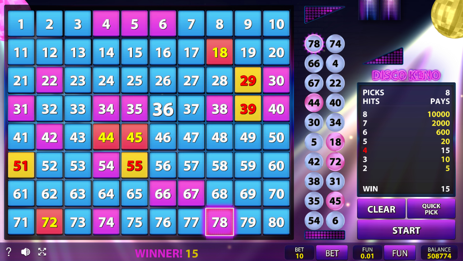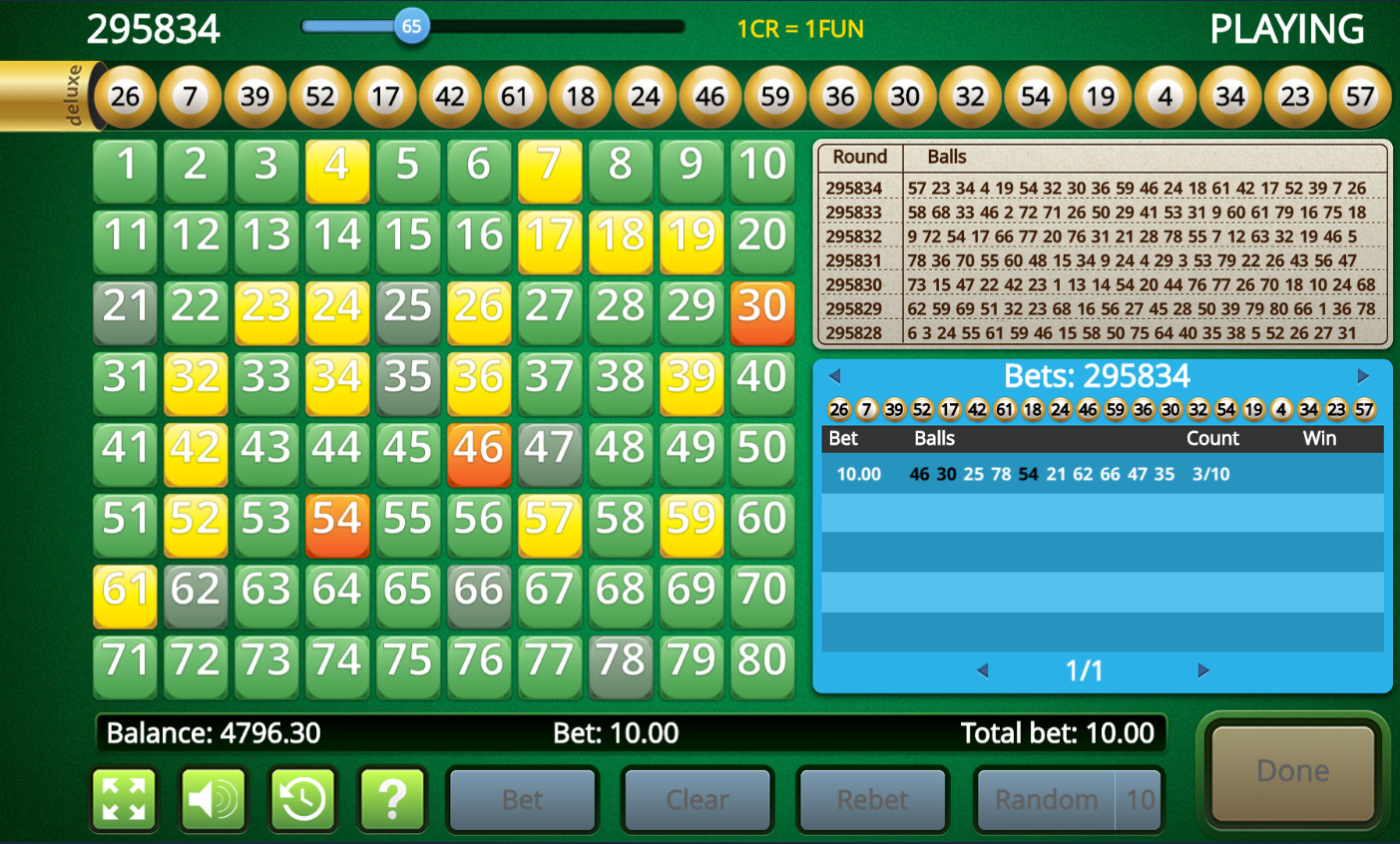 Este jogo tem o mesmo formato e tabela de pagamentos que o X Keno acima. A principal diferença é que não há período de espera entre os jogos; basta clicar em "jogar" para o sorteio das bolas.