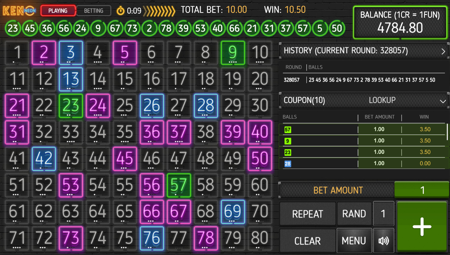 Este jogo parece igual ao X Keno, incluindo o período de espera entre as partidas e a mesma tabela de pagamentos. A única diferença que consigo ver é a temática neon.