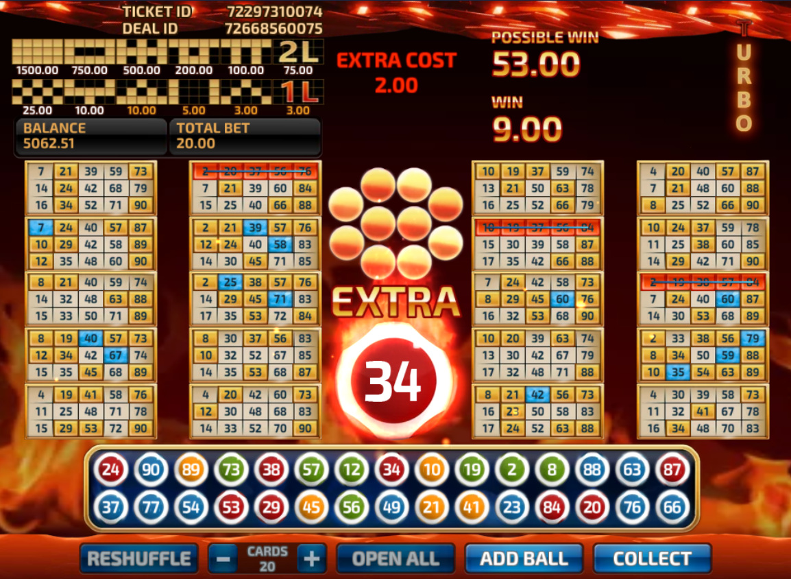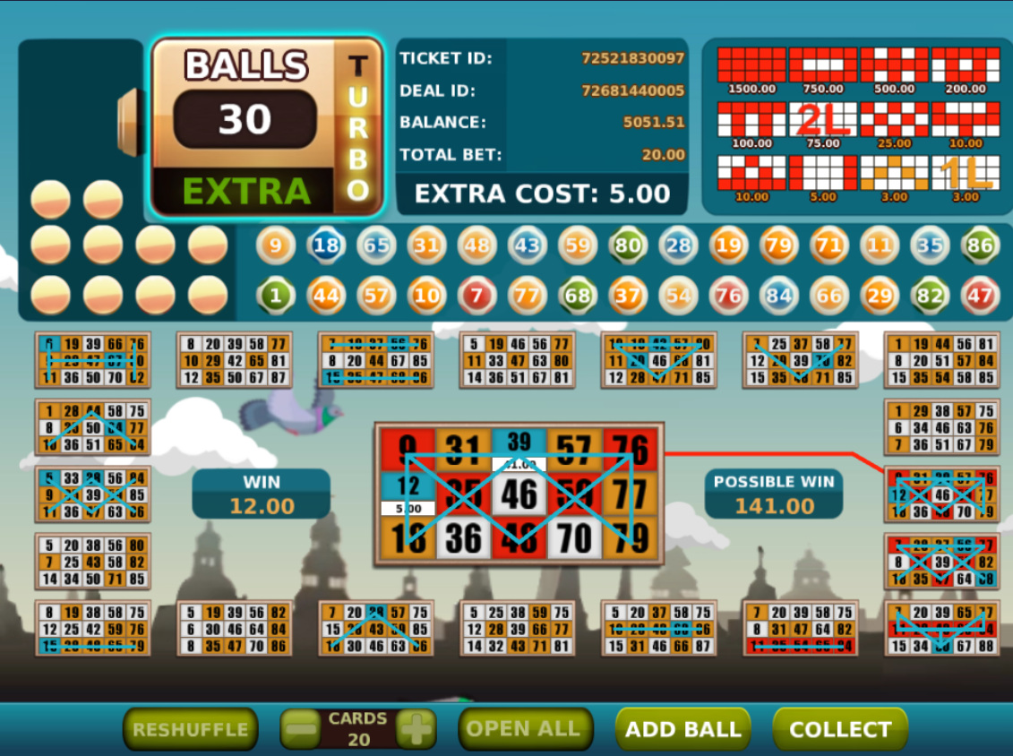 Os dois jogos de bingo são jogados em cartelas latino-americanas de 3x5. O jogador pode comprar bolas extras, que presumo serem precificadas de acordo com o ganho esperado que elas gerariam. As tabelas de pagamento são as mesmas, então presumo que sejam de "skins" (seleções). Nenhuma informação é fornecida sobre o retorno.