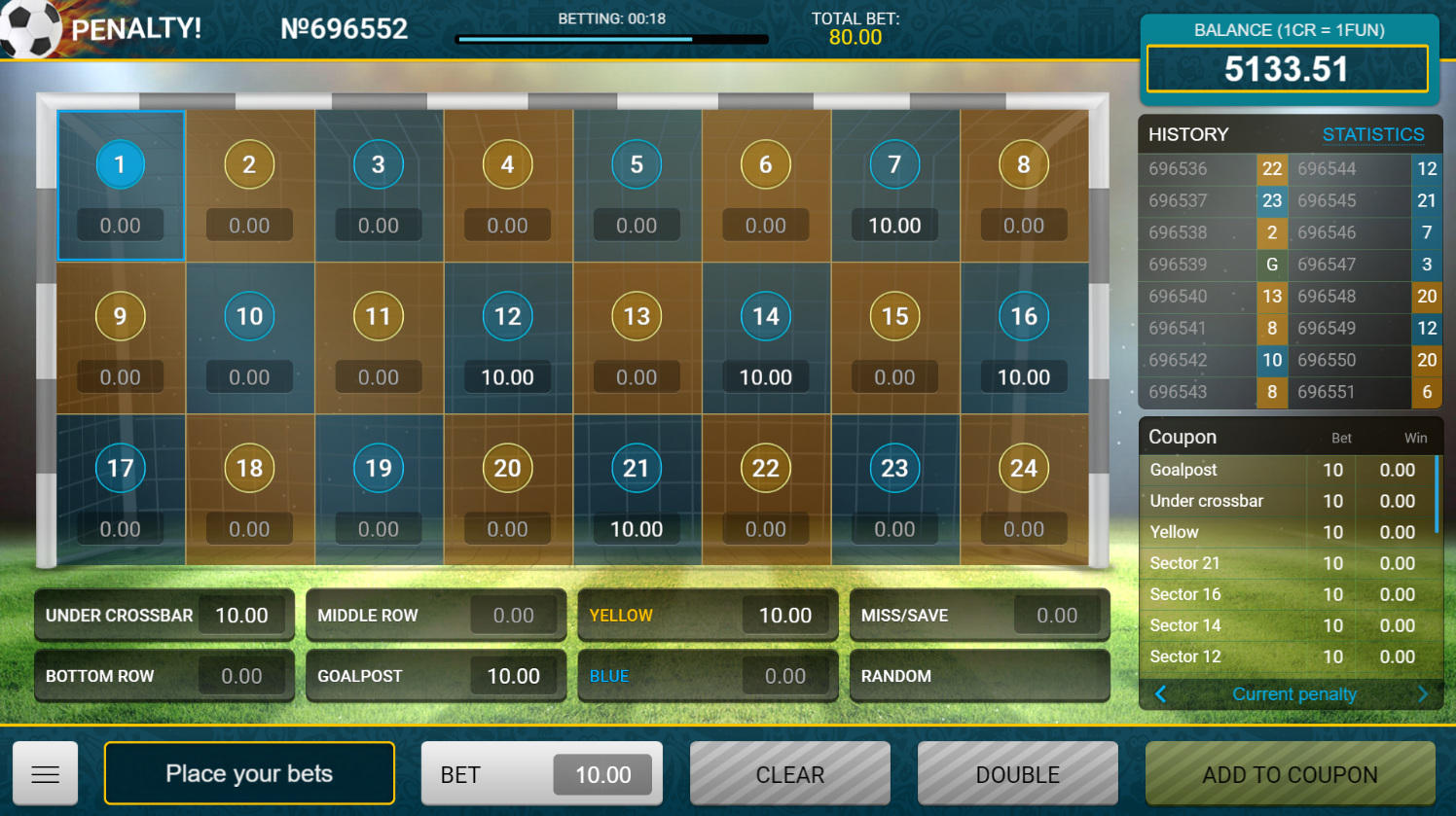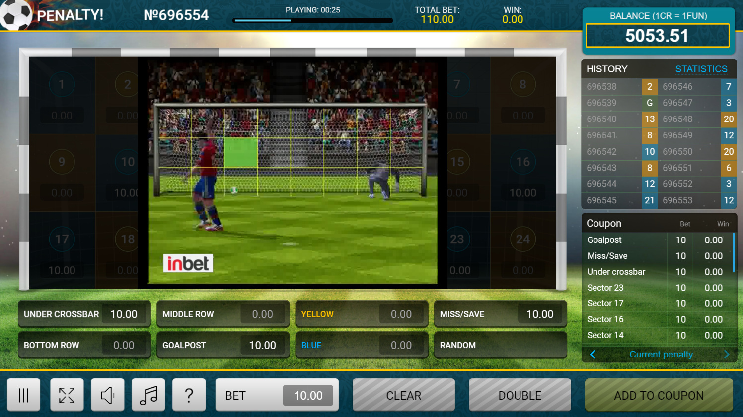 Matematicamente, este jogo é idêntico à roleta de 19 números ou ao Fortune 18 da InBet. Nesta versão, o jogador pode apostar nos números de 1 a 18, de diversas maneiras, ou em uma "defesa". Após um período de apostas, uma bola simulada é chutada para dentro de uma rede de 6x3, numerada de 1 a 18. No entanto, também existe a chance de o goleiro defender o chute, conhecida como "defesa", que presumo ter uma probabilidade de 1/19. Matematicamente, este jogo tem uma vantagem da casa de 1/19, ou 5,26%, em cada aposta.