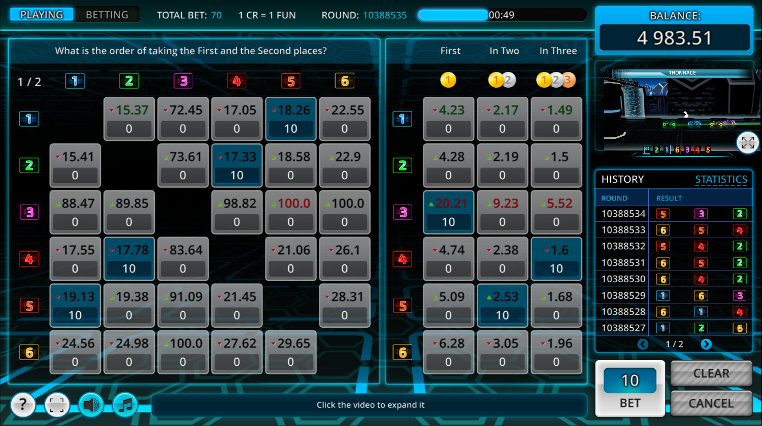 Tron Race é praticamente uma versão alternativa de Dogs 3D . Em vez de corridas de cães, há carros de corrida virtuais, como no filme. Obtenho o mesmo retorno geral de 92,2% para apostas em vitória, segundo e terceiro lugar. Para a única corrida que analisei, o retorno médio da aposta exata é de 91,6%. Suspeito que o limite de 100 para vitórias possa fazer com que o retorno médio da aposta exata varie de corrida para corrida. Também sugiro não apostar em nada com um limite de 100 para vitórias, caso as odds justas sejam maiores e estejam sendo arredondadas para baixo.