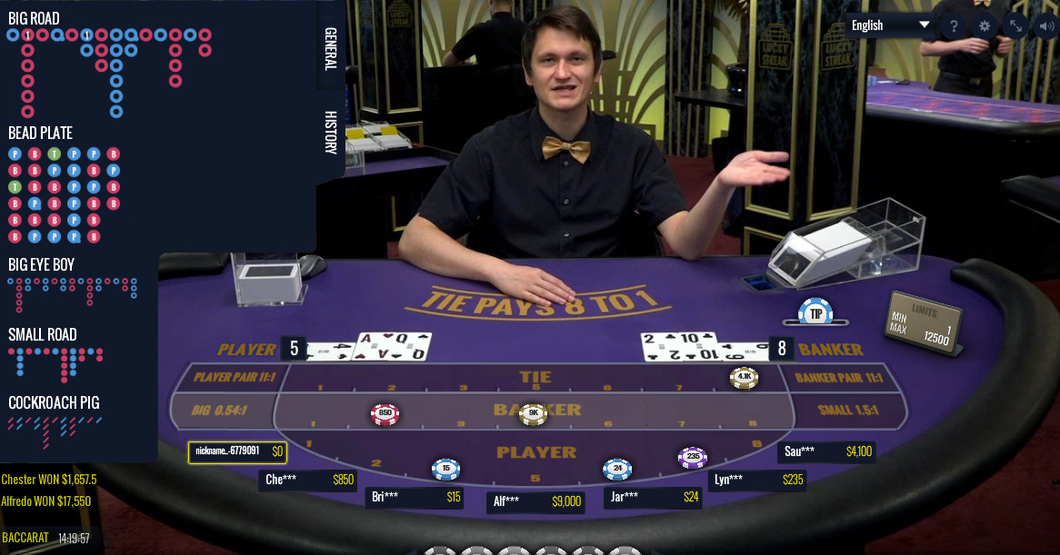 As regras padrão do bacará são seguidas, onde as apostas vencedoras no Banqueiro pagam 0,95 para 1. A seguir, uma lista completa das apostas disponíveis: