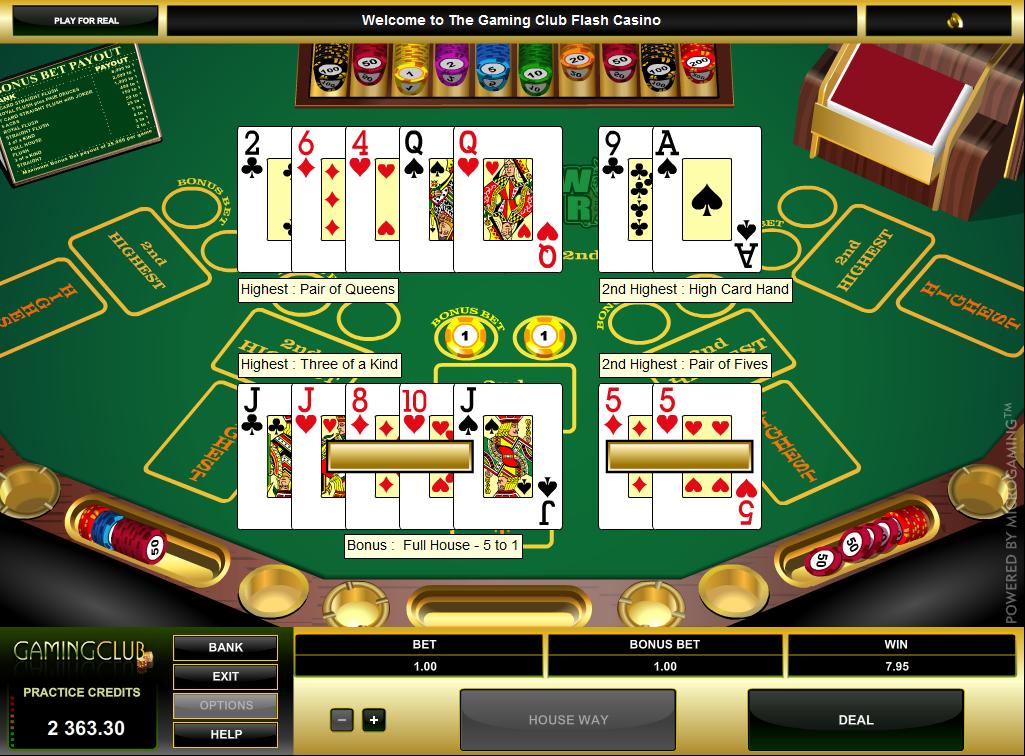 As regras são as mesmas do jogo padrão. A versão da Microgaming segue a tabela de pagamento usual 1-4-5 para o bônus Ante, resultando em uma vantagem da casa de 3,37% na aposta Ante. Já na aposta Pairplus, a tabela é mais generosa, com 1-4-6-30-40, o que representa uma vantagem da casa de 2,32%.