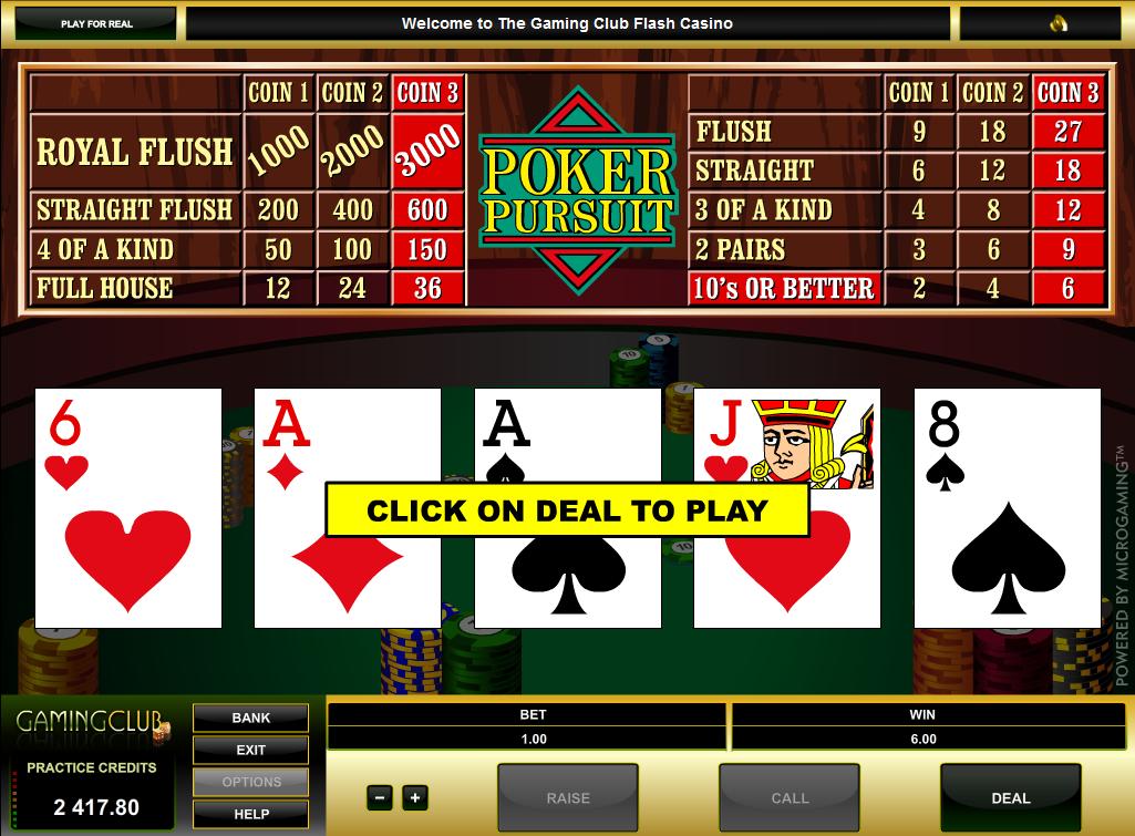 Esta tabela de pagamentos é semelhante à do Let it Ride convencional, exceto que os três primeiros prêmios valem um a menos. Comparada à tabela de pagamentos padrão nos EUA, de 3,51%, a vantagem da casa no Poker Pursuit é de 3,57%.