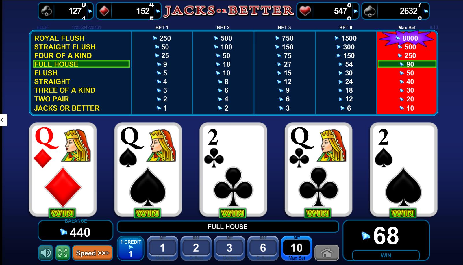 - Recurso de retenção automática : Inicialmente, questionei se estava correto. Por exemplo, em Jacks or Better, eu tinha 6-JA suited com duas cartas ruins. Sugeriu que eu segurasse as três. Pausa. Normalmente, em Jacks or Better, você seguraria as duas para um Royal Flush nessa situação. No entanto, o conselho dado estava correto, pois um Royal Flush paga apenas 400, diminuindo o incentivo para tentar um.