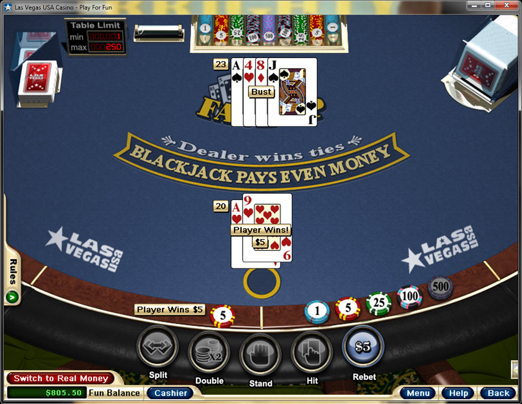 O dealer é sempre o banqueiro e a comissão usual de 5% é cobrada sobre as vitórias. A sequência de Ás-5 é a segunda mais alta. As cartas são convenientemente organizadas em ordem e o jogo avisa o jogador se ele cometer um erro na mão. Não há botão para "jogada da casa". Um aspecto notável deste jogo é a elaborada estratégia da casa seguida pelo dealer.