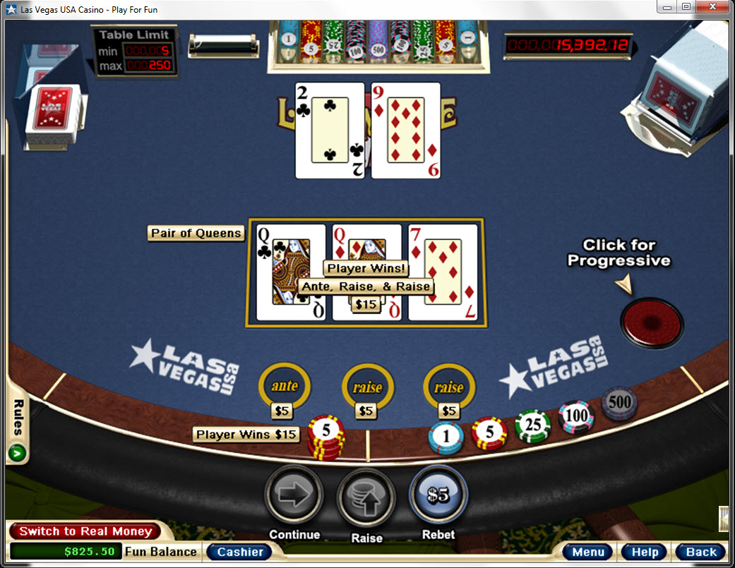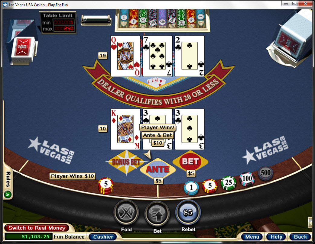 A variante de pôquer apresenta a versão liberal das regras de Las Vegas, onde o jogador precisa apenas de uma sequência vencedora para ganhar a aposta Ante. Isso resulta em uma vantagem da casa de 2,04%.