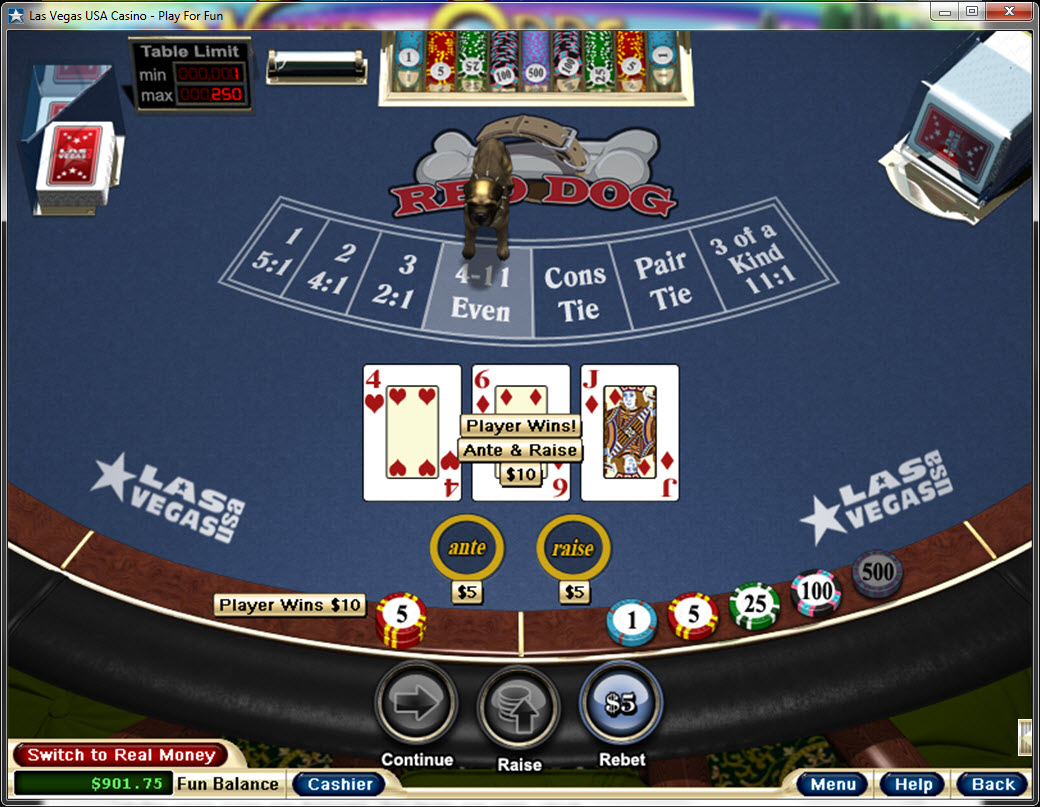 As regras habituais do Red Dog são seguidas. Disseram-me que são usados dois baralhos, o que resulta numa vantagem da casa de 3,08%.
