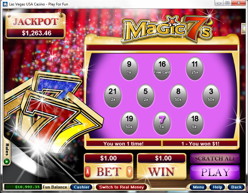 A RTG oferece quatro jogos de raspadinha: os três mostrados acima, além do Magic 7's . As regras não são quantificadas, então não tenho ideia do que você pode esperar em termos matemáticos. Portanto, com as raspadinhas, você terá que se virar sozinho.