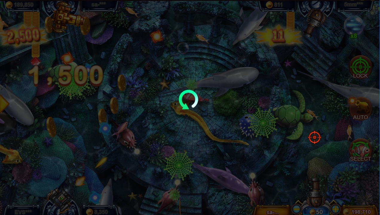 À primeira vista, o objetivo de Fisherman Gold parece ser atirar em peixes. E, na verdade, é muito bem feito. Esta captura de tela não faz justiça ao jogo; ele não é tão escuro assim, mas o meu programa de captura de tela não funcionou bem. Não encontrei nenhuma regra específica, mas, baseado em jogos similares que vi em outros lugares, cada vez que você atira, é como se estivesse fazendo uma aposta, e o valor do prêmio é aleatório e não depende de acertar nenhum peixe. Corrijam-me se eu estiver errado.