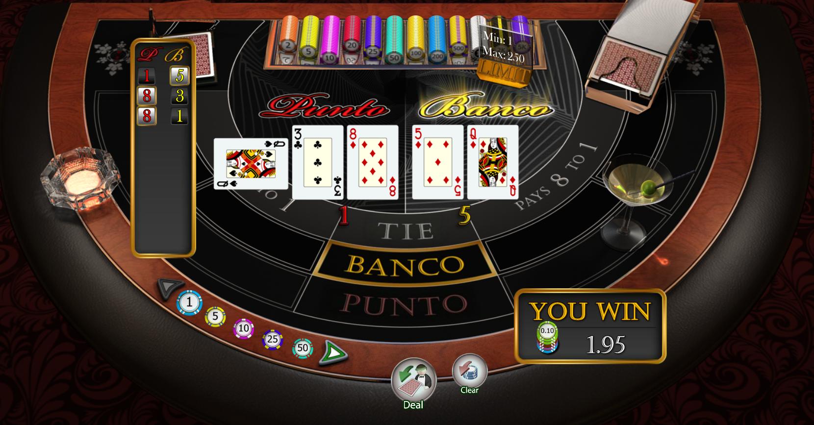 É a mesma coisa que bacará . Acho que "punto banco" soa mais exótico. São usados seis baralhos e as regras padrão são seguidas. As probabilidades para o empate são geralmente baixas, de 8 para 1. A vantagem da casa em cada aposta é a seguinte: