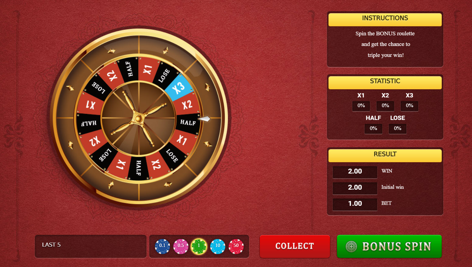 O site também oferece um jogo chamado Roleta Bônus, no qual o jogador pode apostar seus ganhos em uma roda bônus. A tabela abaixo mostra as porcentagens da roda bônus. A célula inferior direita indica um retorno médio de 100% na roda bônus. Já que você está jogando, por que não aproveitar uma oportunidade sem vantagem da casa?