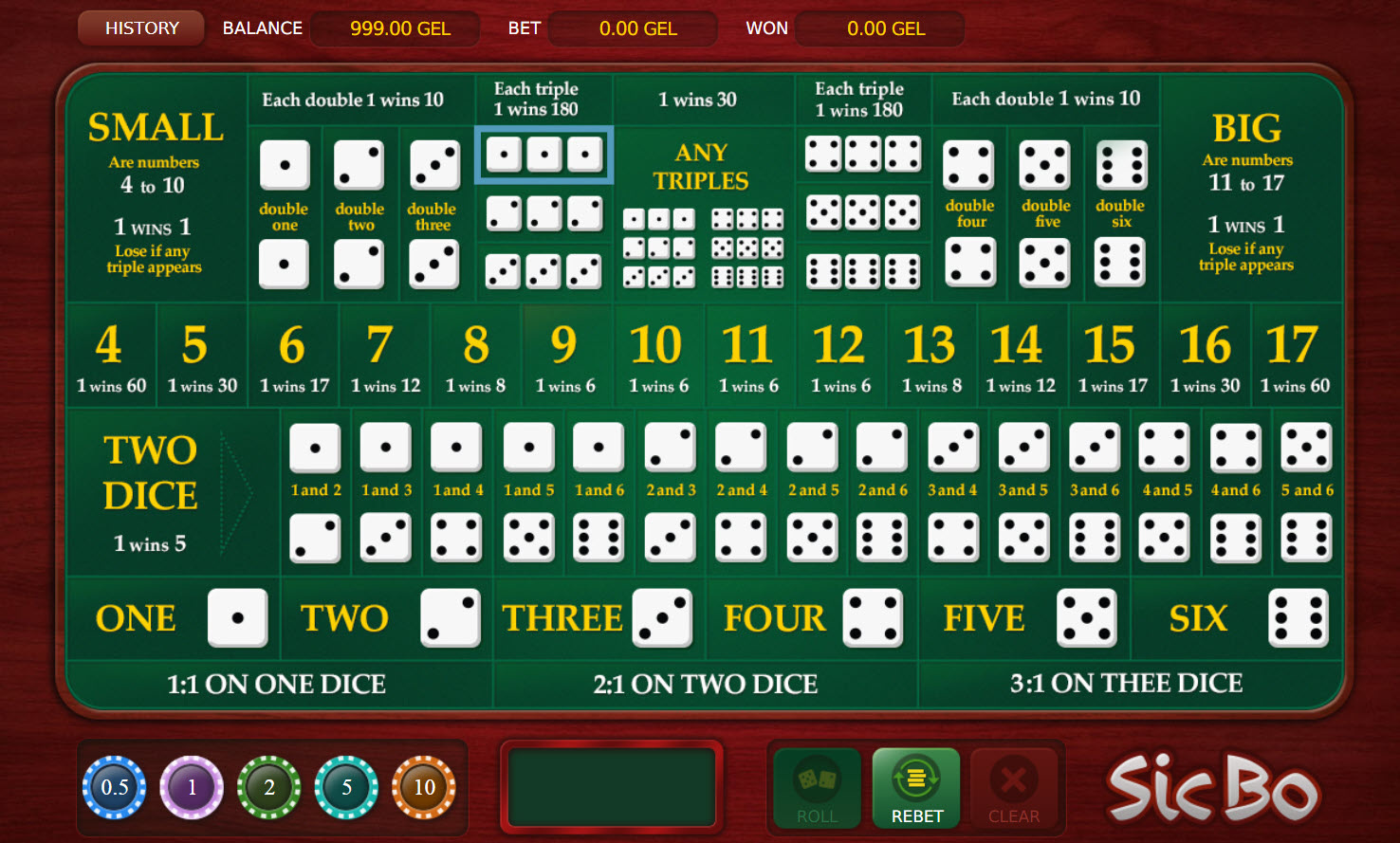 O jogo de sic bo segue probabilidades bastante desfavoráveis, como mostra a tabela abaixo.