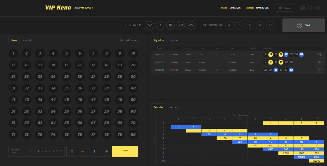 Keno Clássico e Keno Pessoal me parecem a mesma coisa. Ambos seguem a seguinte tabela de pagamentos. Existe outro jogo chamado Keno Russo, mas não consegui fazê-lo funcionar.
