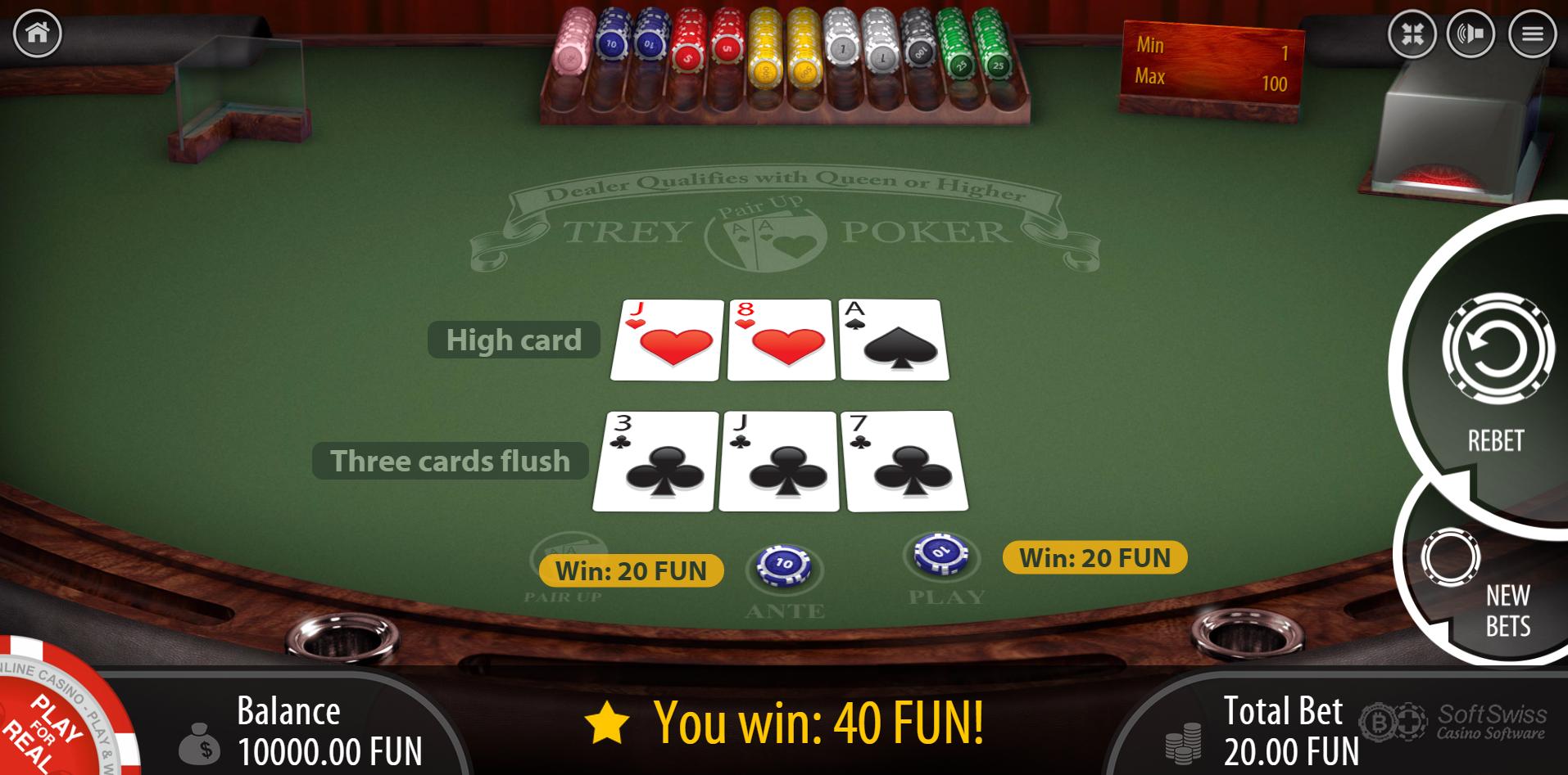 A SOFTSWISS chama seu jogo Three Card Poker de Trey Poker. O bônus Ante segue a tabela de pagamento usual 1-4-5, com uma vantagem da casa de 3,37%. O que normalmente é chamado de aposta Pair-Plus é chamado de aposta Pair Up, que segue uma tabela de pagamento 1-3-6-30-40-100 (incluindo 100 para um mini royal), com uma vantagem da casa de 5,10%.
