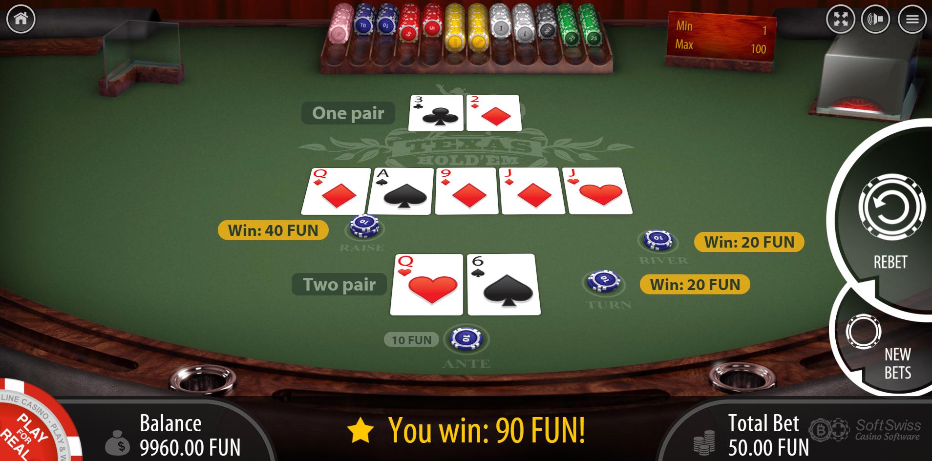 A SOFTSWISS segue as regras liberais de Las Vegas para o Texas Hold 'Em Bonus , onde o Ante paga com uma sequência ou melhor, resultando em uma vantagem da casa de 2,04%.