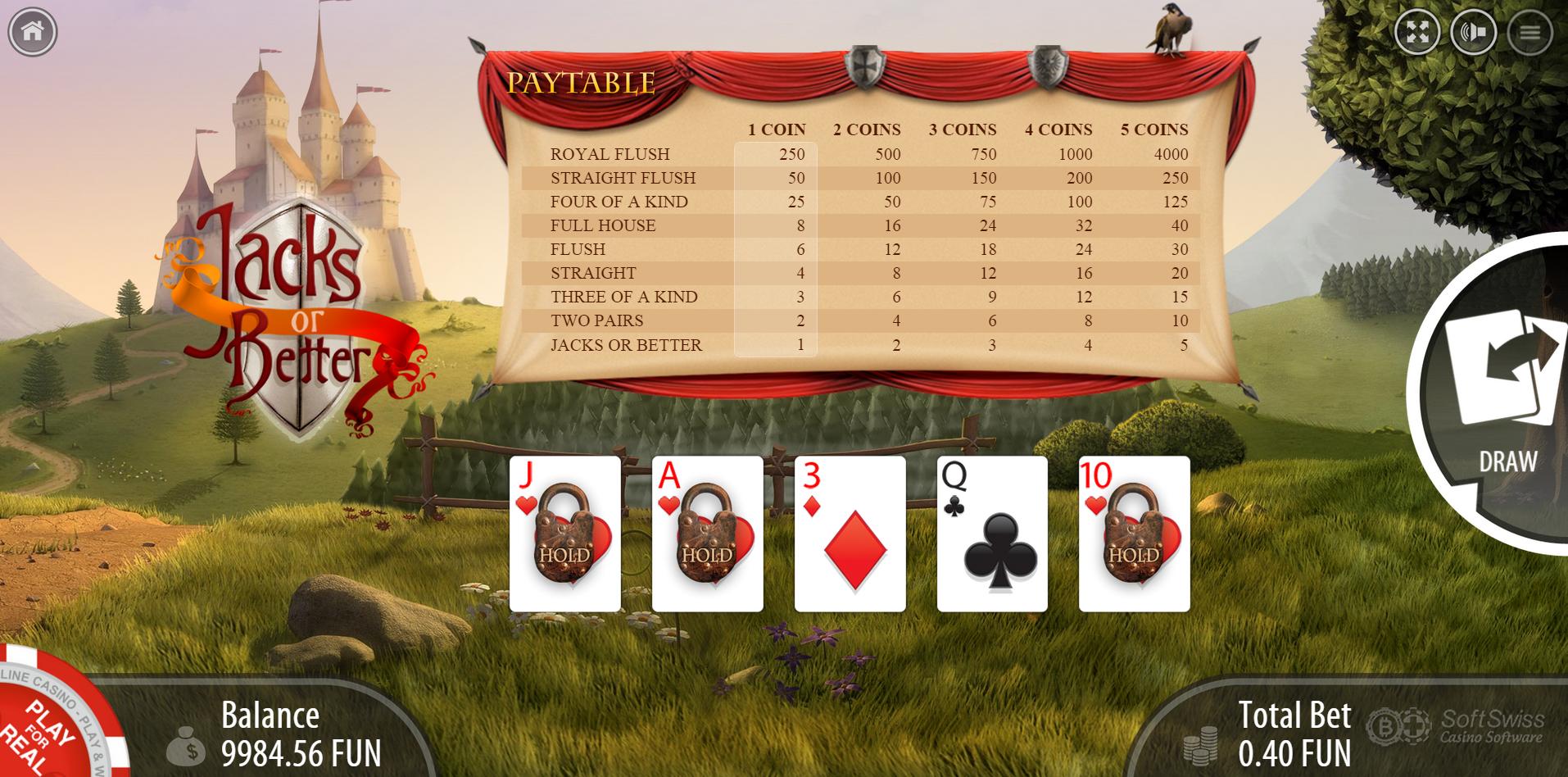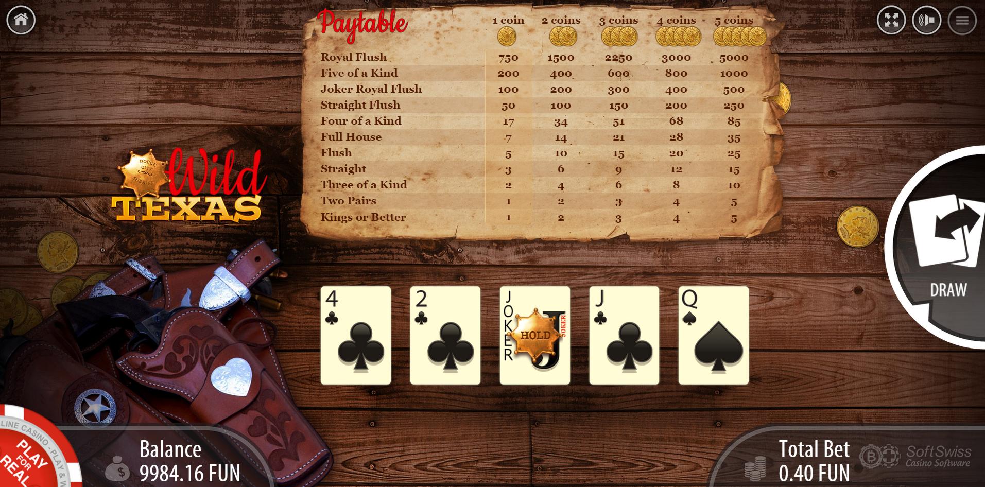 Existem apenas dois jogos de video poker: Jacks or Better e Joker Poker. O Joker Poker também é conhecido pelos nomes Japan Dream e Wild Texas. Não consegui acessar o Japan Dream durante a avaliação, mas pude visualizar a tabela de pagamentos, que era a mesma do Wild Texas.