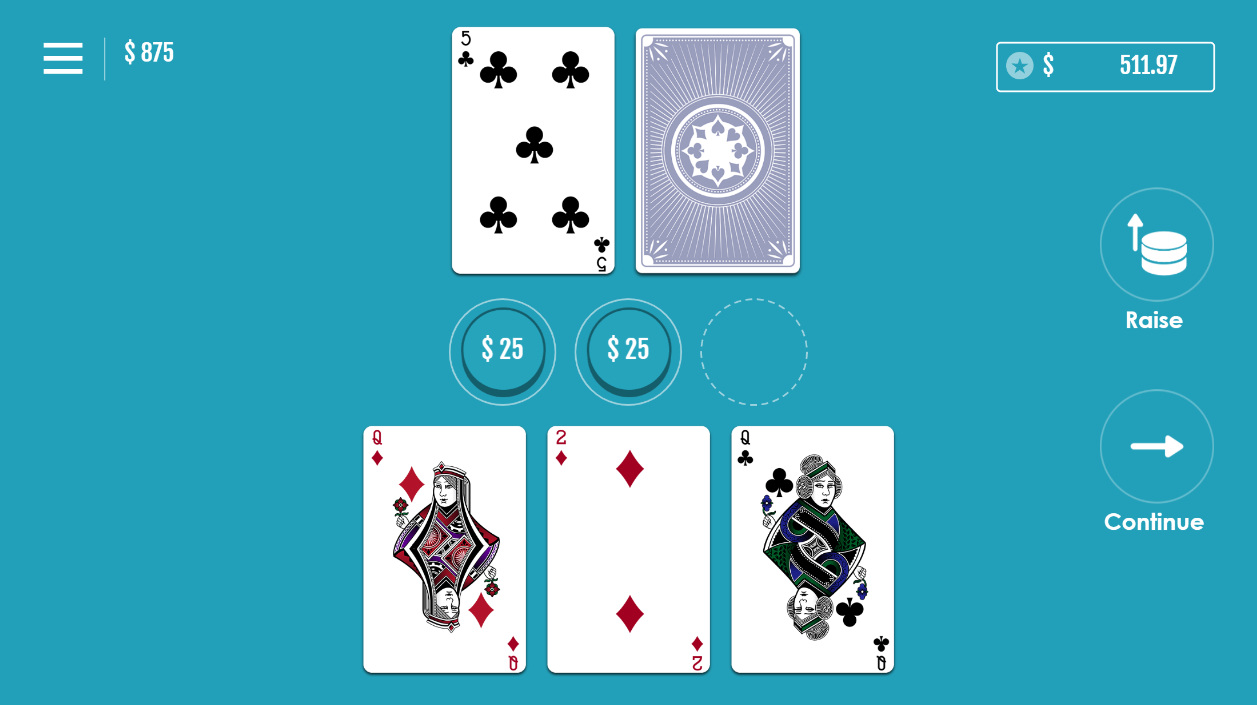 A tabela a seguir mostra os pagamentos das apostas com base no número de cartas distribuídas (sem incluir a carta do meio), a probabilidade de ganhar e o retorno esperado. Os ganhos são calculados na proporção de "um para um".
