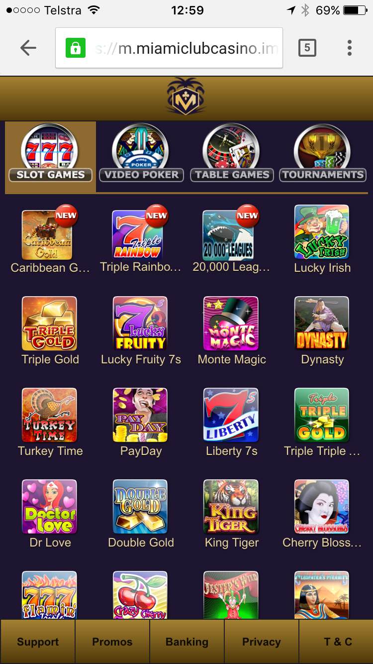 Outro exemplo de cassino onde você poderá desfrutar da garantia publicitária do Wizard of Odds é o Miami Club Casino . Mais uma vez, a gama completa de jogos não está disponível em dispositivos móveis como estaria em um computador. Por exemplo, na seção de Jogos de Mesa, parece haver apenas seis jogos no total, incluindo quatro versões de Blackjack e, por algum motivo, também incluem Keno , que eu não consideraria um Jogo de Mesa. Há mais de três vezes essa quantidade disponível no site do Miami Club.